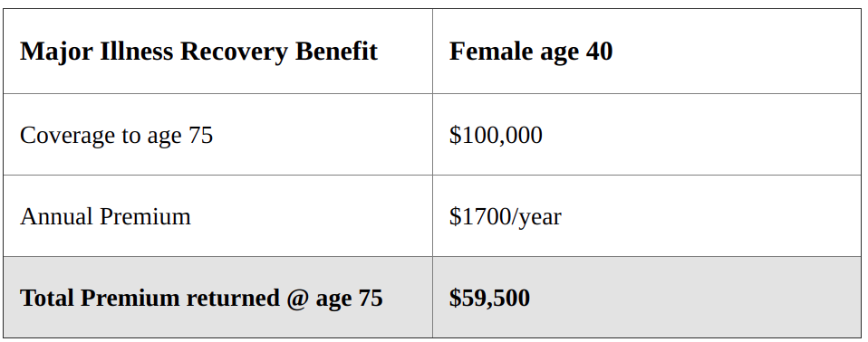 In the below example, during the 35 years of coverage, you are entitled to $100,000 if you survive a major illness such as Cancer, Heart Attack, or Stroke. There are many more covered conditions, however, these three are the most common that people will claim on.