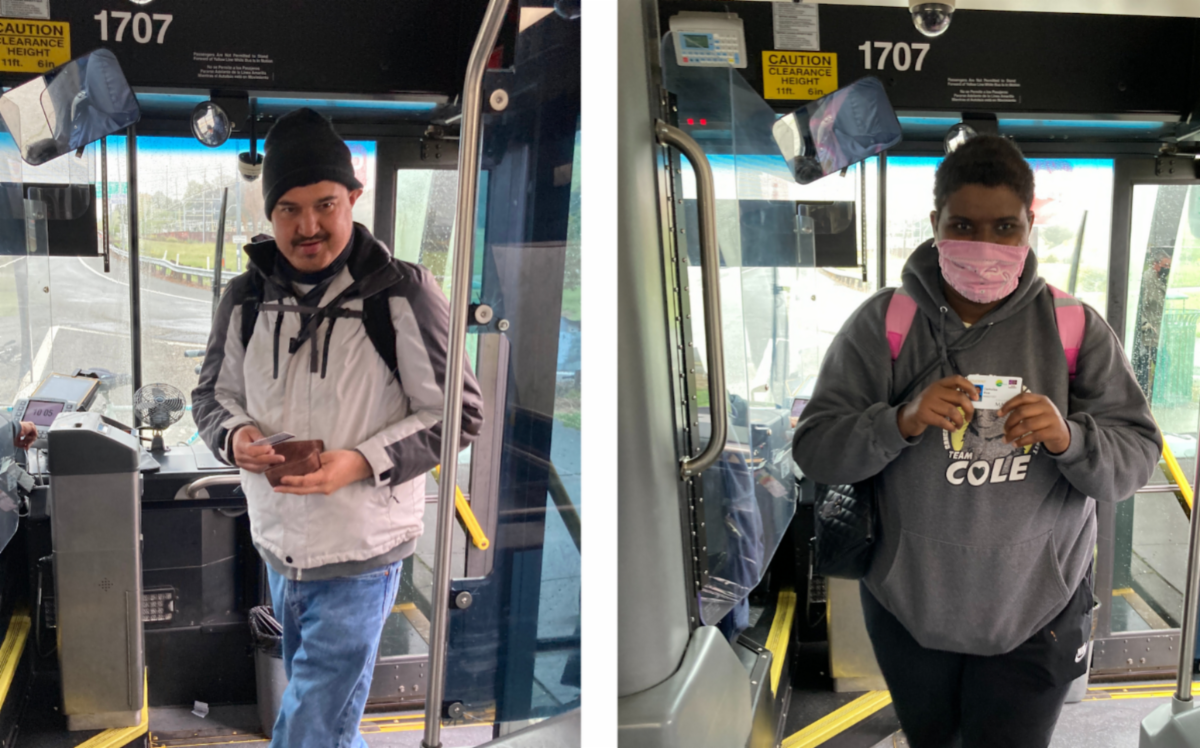 Image Description: Digital images of Arc Marin participants PJ and Demelza boarding a public bus. | |