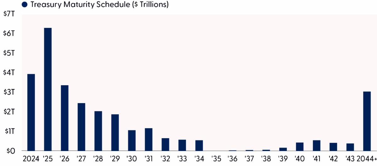 While economic growth will remain the driver of interest rates, a secondary risk to rates remains the amount of Treasury debt needed to fill federal budget deficits that are expected to stay elevated. Per the Congressional Budget Office (CBO), the U.S. government is expected to run sizable deficits over the next decade — to the tune of 5–7% of gross domestic product (GDP) each year. The deficit increases significantly in relation to GDP over the next 30 years, reaching 8.5% of GDP in 2054. That growth results from rising interest costs and large and sustained primary deficits. CBO deficit projections assume no new spending initiatives nor an extension of the Tax Cuts and Jobs Act, which is set to sunset at the end of 2025, so the CBO forecast likely underestimates budget deficits going forward. And to fill those deficits, the Treasury Department will need to issue trillions more in Treasury securities. But complicating the math for the Treasury Department, it will also need to roll over more than $6 trillion in Treasury securities set to mature in 2025. Thus, the Treasury will need to find investors for some $8 trillion of Treasury debt over the next 12 months.
