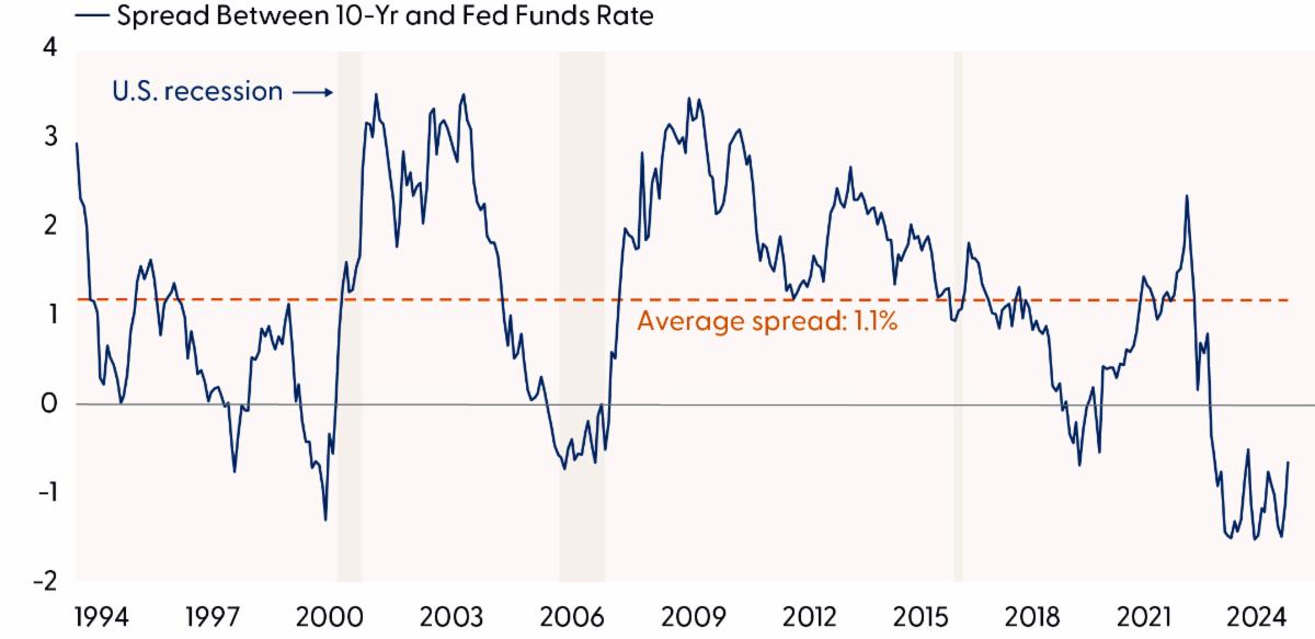 Current market pricing suggests the Fed will take the fed funds rate back to around 3.5–3.75% in 2025. If markets are right, and the U.S. Treasury yield curve eventually reflects its historical upward-sloping shape, that likely means the 10-year yield should remain around current levels. The spread between the fed funds rate and the 10-year Treasury yield has averaged around +1.1% in non-recession periods, meaning the 10-year yield, on average, has been higher than the fed funds rate by around 1.1%, albeit with a large range when not in a recession. So, unless/until economic data starts to show signs of a sustained slowdown, the 10-year could fluctuate between 4.0% to 4.5% to start 2025. But, if the economy does show signs of slowing, the Fed could cut rates more than what is priced in, which would mean the 10-year Treasury yield could get back into the 3.75–4.25% range to end the year, which is our expectation.