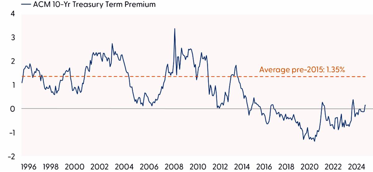 So, how does this affect fixed income investors? A positive term premium could keep longer-term interest rates elevated, perhaps reducing the diversification benefits of core bonds. Regarding the former, while monetary policy expectations will continue to be the dominant driver of interest rate changes, Fed rate cuts may not have the desired effect, and longer-term interest rates may not fall as much as they would have without a positive term premium (like we’ve seen recently). In terms of the latter, while we still believe Treasury securities will be the safe-haven choice in the case of a broad macro equity market sell-off, they may not be the best defensive option for garden-variety equity market sell-offs.
