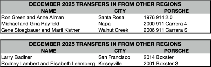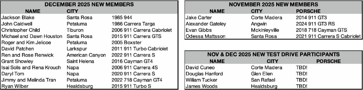 2025. It’s come and gone, and with it the holiday season (I hope yours was great). Even the 1/1 Fun Run is in the recent past. On to 2026 and more memorable Porsche/PCA Redwood Region events.