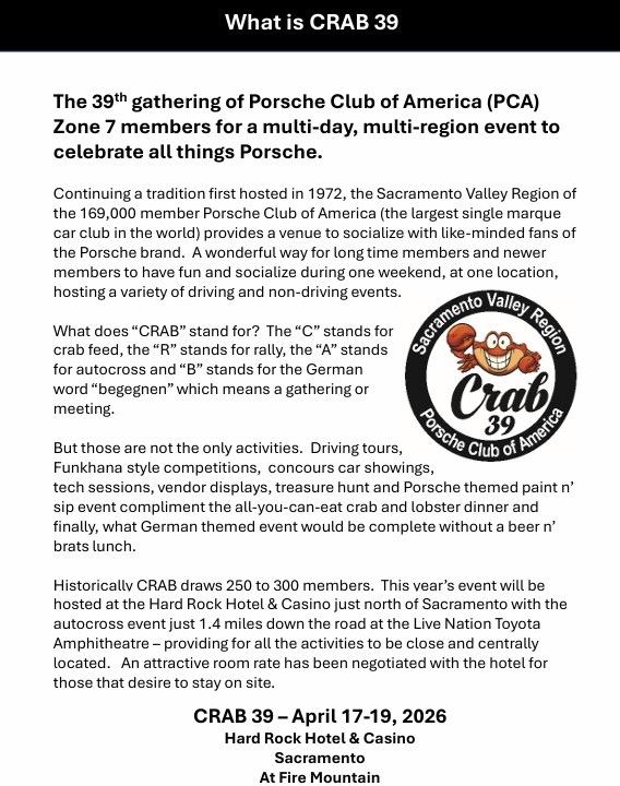 Our calendar for the year is panning out to be a very busy one, with some long-time events that everyone continues to love such as the Run for the Crab (on February 21), Porsches on the Plaza, our Concours, and the annual Holiday Party. There are several mid-week tours being planned and the possibility of multi-day trips to SoCal and up north into Humboldt County. Keep an eye on our website calendar as the year progresses.