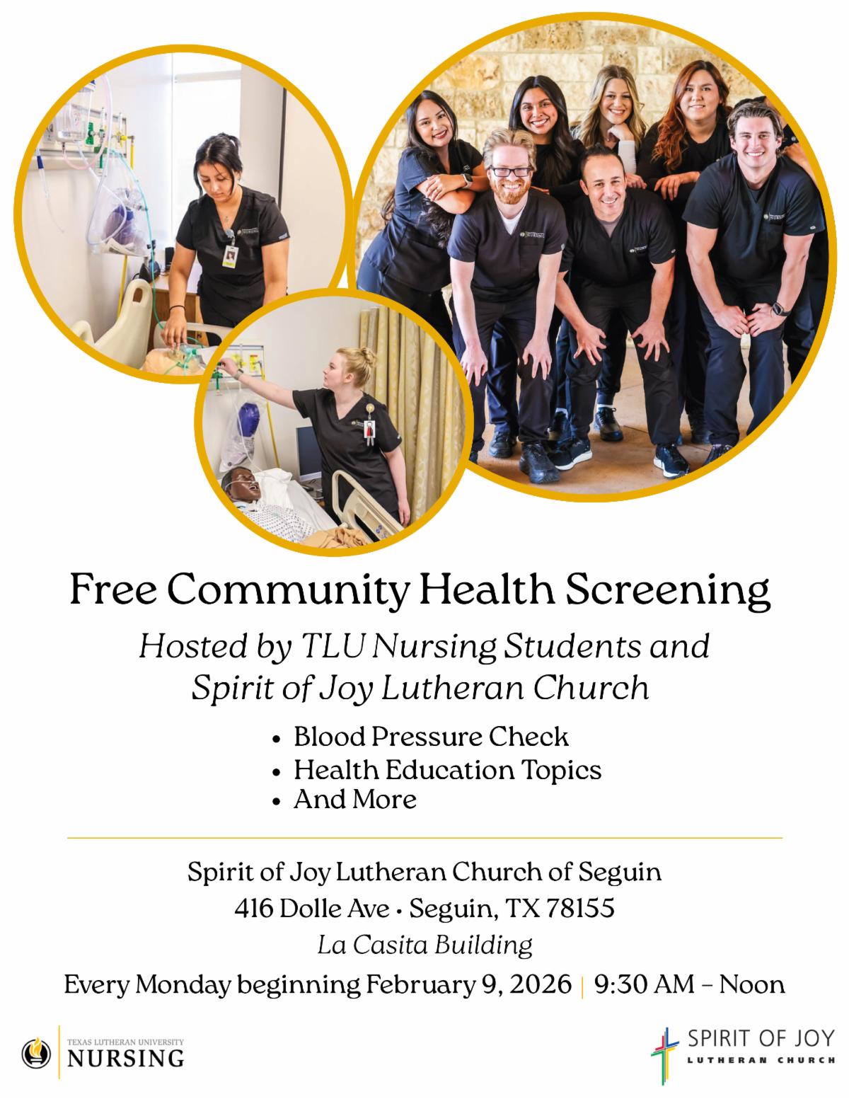 | | Free Community Health Screening: Help us get the WORD out about our new partnership with the TLU Nursing Students! Mondays in La Casita, from 9:30am to 12:00pm... | | |