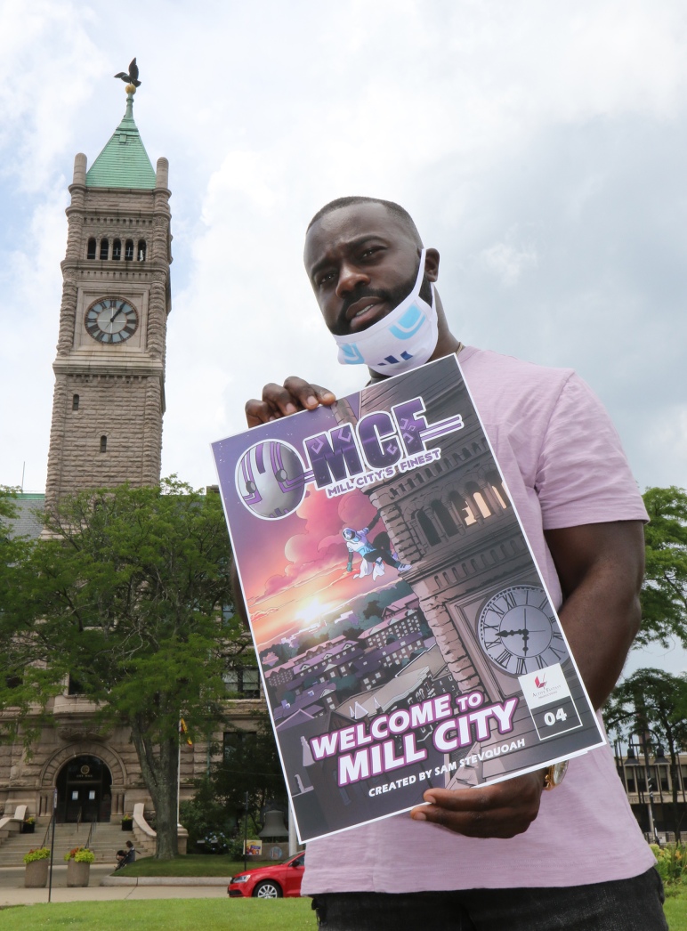 In his fifth and latest graphic novel, Welcome to Mill City, Stevquoah introduces Aundre Weah, a Lowell high student by day and crime-fighting superhero, Momolu, by dismissal time. In the series, readers will get to see some of their favorite Lowell landmarks as animated drawings, like the Lowell Sun building and the City Hall clock tower.