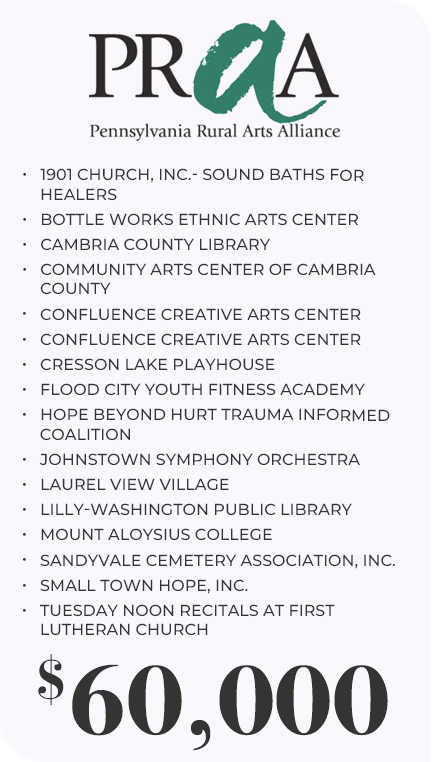 Under Becky’s leadership, PRAA has become a vital partner to the 1889 Foundation, providing technical assistance, workshops, conferences, and grant programs that help small arts organizations and individual artists thrive in rural southwestern Pennsylvania. One of their flagship initiatives, the Creative Health Impact Grant (CHIG), supports arts programs that improve health and wellness in Cambria and Somerset Counties. Through this partnership, PRAA helps bring creative expression and holistic well-being together, enriching lives and strengthening communities. Becky’s dedication and vision continue to inspire, showing how the arts can be a powerful force for connection, healing, and community growth.