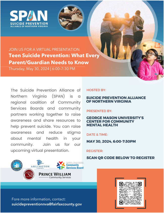 The Suicide Prevention Alliance of Northern Virginia (SPAN) is collaborating with George Mason University’s Center for Community Health to host a Zoom presentation on “Teen Suicide Prevention: What Every Parent/Guardian Needs to Know” on Thursday, May 30th from 6pm to 7:30pm. To sign up for the event, please see the flyer and QR code.
