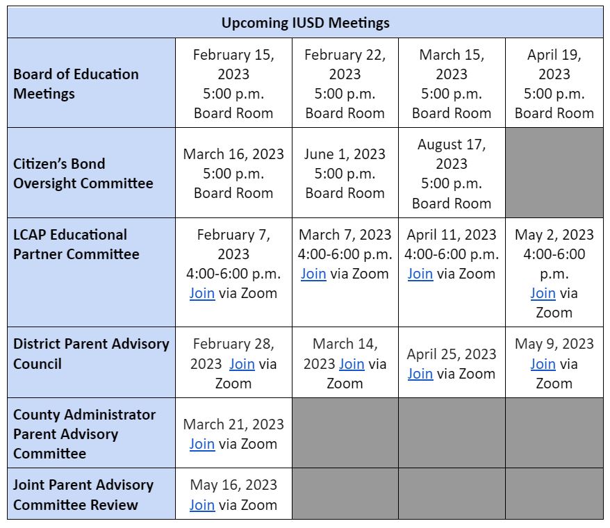 Subscribe to our IUSD Newsletter and learn about important information and exciting events. We share and celebrate the great accomplishments from our amazing students and staff and their fantastic work. Stay connected and sign up by clicking here today!