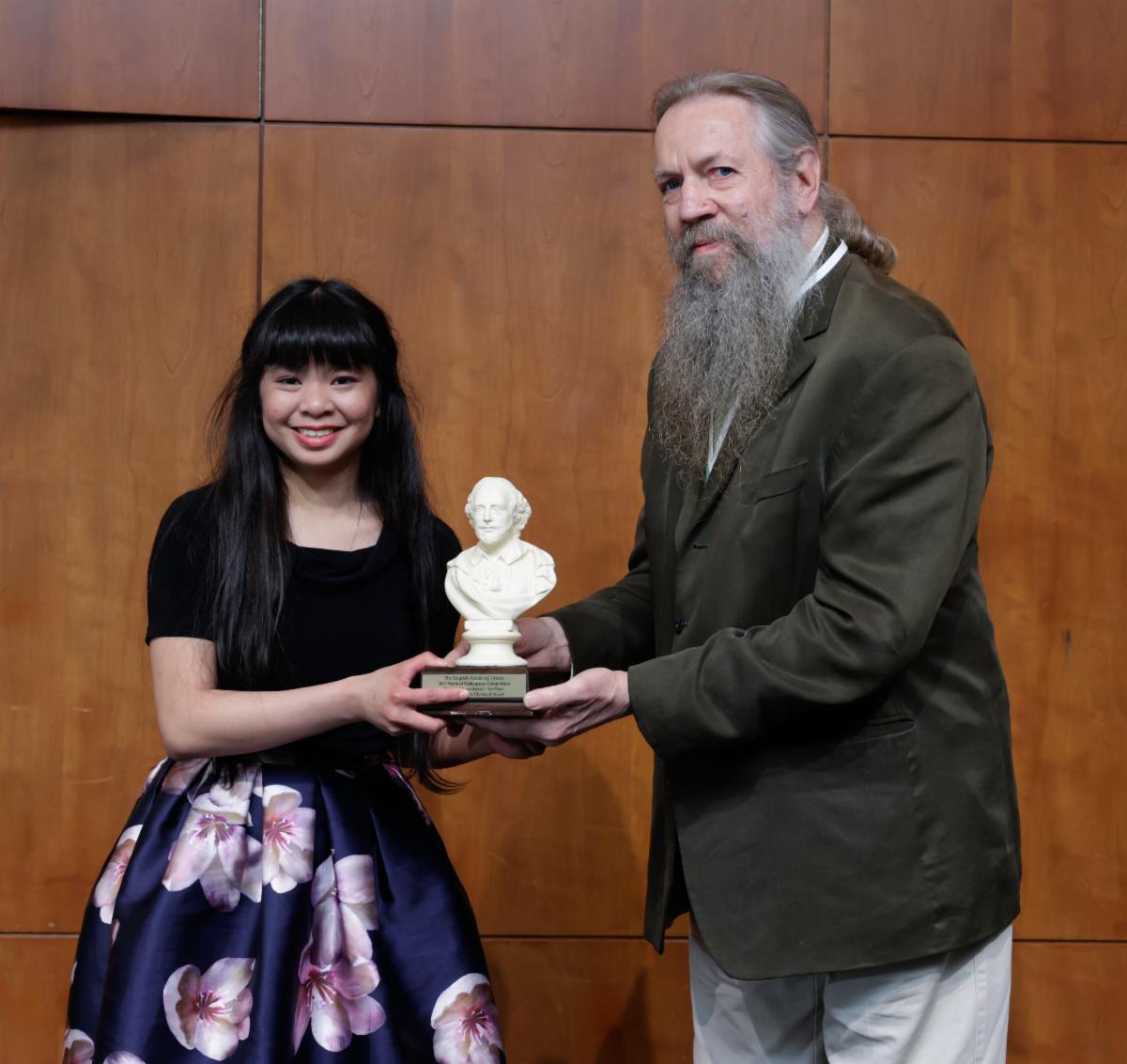 Elena Hollenbeak of the ESU Hawaii Branch won the grand prize - scholarship to the British American Drama Academy Midsummer Conservatory Program in London - with her thoughtful renditions of Sonnet 14 and Lady Macbeth from Macbeth. Her teacher, Lyn Ackerman at St. Andrews School – the Priory, received the $1,000 Teacher Recognition Award.