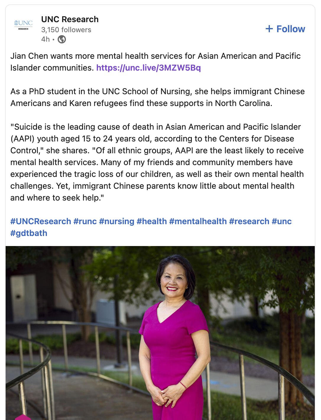 北卡大学教堂山分校在《北卡罗来纳大学研究》上发表了UCA WAVES执行长、北卡大学教堂山分校博士生陈健(Lily Chen)的故事,以帮助扩大亚太裔的声音。