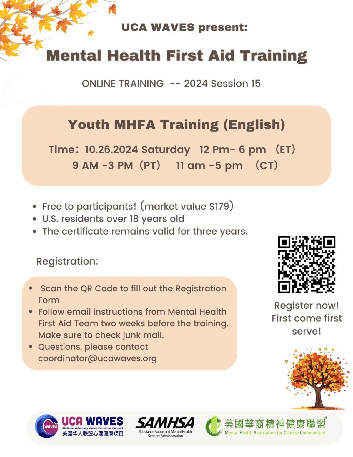 这个免费的培训可以帮助我们学习有关精神健康的知识。通过学习,可以及早接收到这些求救信号,及早发现症状,并学习怎样有效帮助身边的人以及自己社区的人。名额有限,请大家报名从速。
