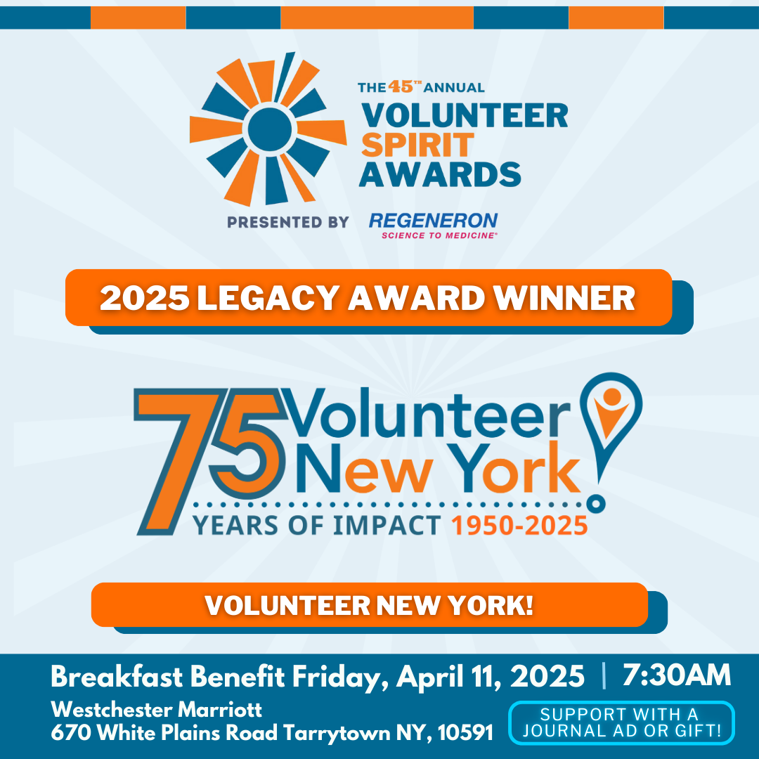 This year, the Volunteer Spirit Awards will also serve as Volunteer New York!’s 75th anniversary celebration. By honoring Volunteer New York! with the 2025 Legacy Award, we celebrate not just the organization itself, but the thousands of volunteers, partners, staff, and supporters who have fueled our mission over the past 75 years. This signature event will be the largest public celebration of our anniversary, and a moment to reflect on the collective power of volunteerism that continues to inspire, uplift, and strengthen our communities.