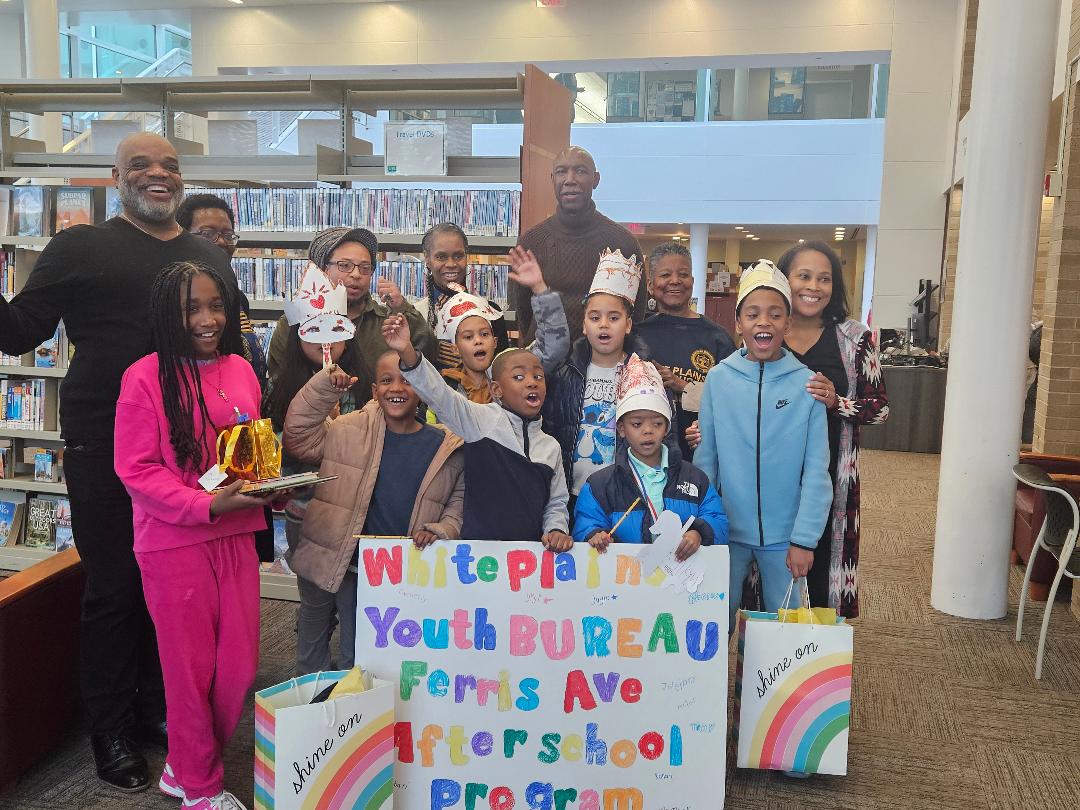 Byron Smalls and Amy Flowers of the White Plains Youth Bureau team worked with children from the Ferris Avenue and Church Street Before School Programs on special art projects for the contest. Byron and Amy celebrate with the students in the accompanying photo.