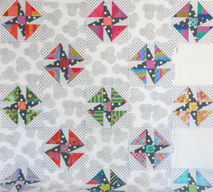 First I tried alternate blocks cut from Michael Miller's "Stitch Circle" dot in gray on white. Light-and-airy for sure, but the dotted triangles in the blocks are lost, and the blocks are dwarfed by the alternate squares.