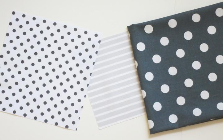 For the supporting fabrics,I chose a a smaller gray-and-white dot ("Dumb Dot" by Michael Miller), a subtle gray-and-white stripe, and a large gray-and-white dot. (I don't have selvage info on the last two fabrics; sorry)