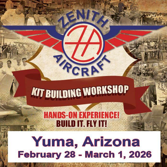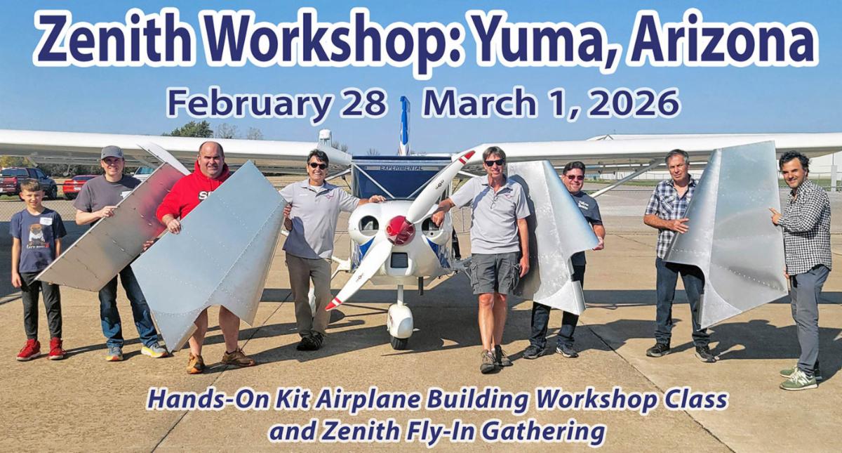 | | As previously announced, Zenith Aircraft Company is taking its popular hands-on kit aircraft building workshop on the road to Yuma, Arizona, in end-February. The two-day workshop will be held Saturday, February 28th and Sunday, March 1st, 2026, at the Somerton Airport (54AZ), in Arizona (just south of Yuma). | | The hands-on workshop class will start on Saturday morning, February 28th, inside a large private hangar at the Somerton airport and will conclude the following day. Also on Sunday, March 1st, local organizers and Zenith will host an informal regional fly-in gathering for Zenith aircraft owners, flyers and enthusiasts. “We already have an active community of Zenith aircraft builders and pilots spread throughout Southwest Arizona and southern California,” said Sebastien Heintz, Zenith Aircraft’s president. “We look forward to seeing many of them and their flying Zenith projects.” | |