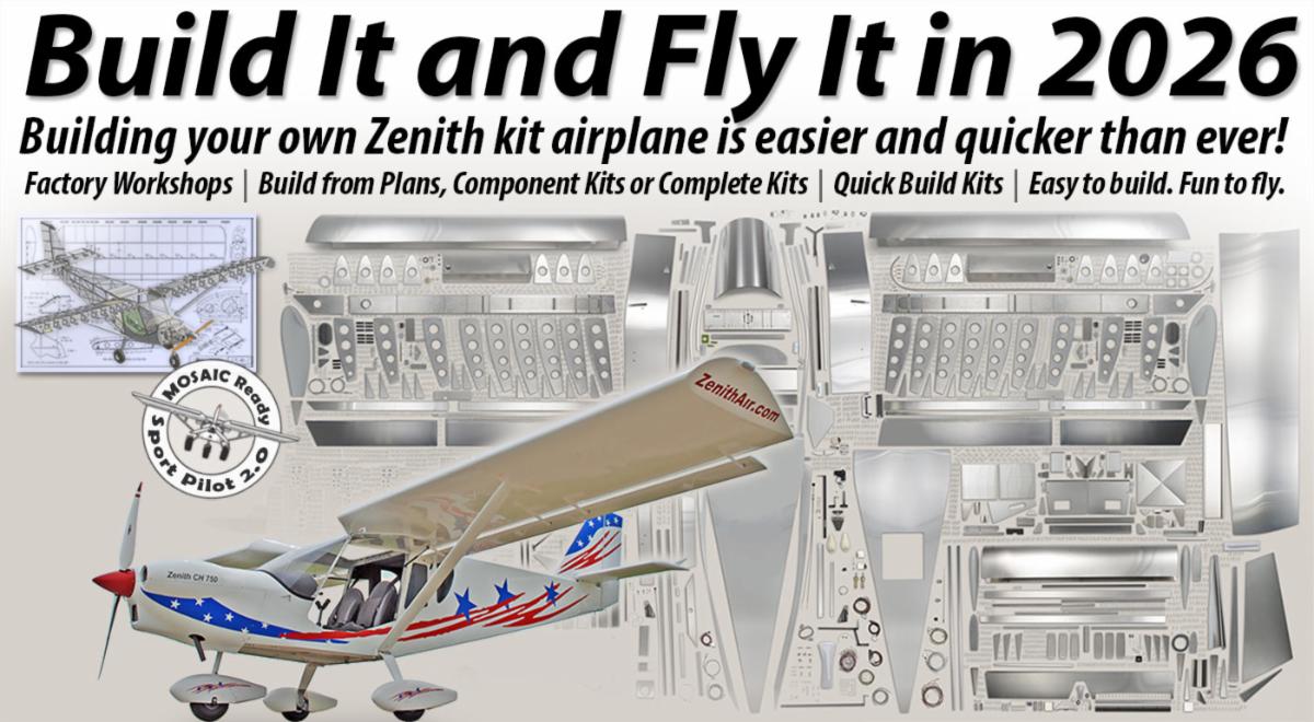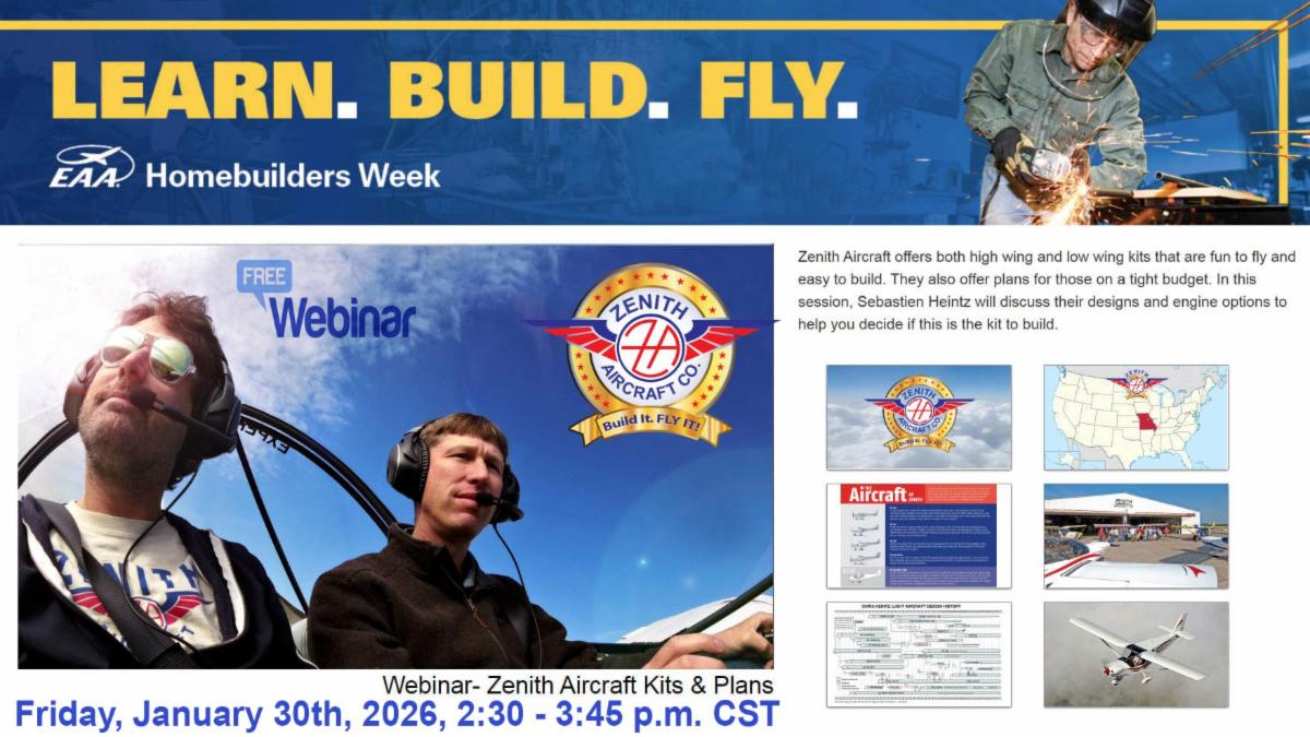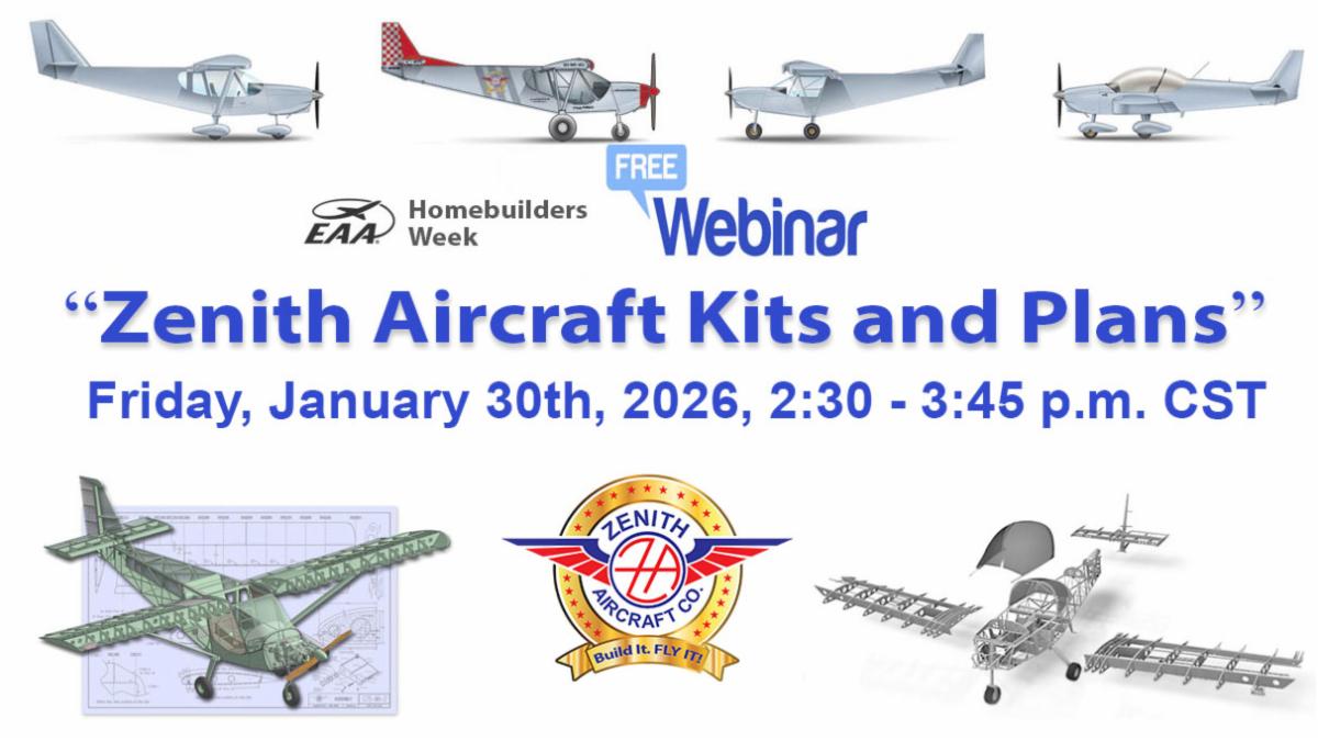 | Join the Experimental Aircraft Assoc (EAA) on January 26-30 for their annual Homebuilders Week online event. Experts from all corners of the homebuilt aircraft community share their knowledge and information with builders everywhere through free and interactive webinars. | | | | You too can get a head start in building your own airplane in 2026 by participating at an upcoming hands-on workshop class to learn all about the skills and tools needed to build your own. Zenith invites you to experience the excitement of building your own airplane at one of our monthly hands-on workshops, held at our kit aircraft factory in central Missouri or at select locations (see below). These workshops give you the chance to learn the skills and tools needed to build your own aircraft while constructing your very own rudder tail section for one of Zenith’s popular designs, such as the high-wing Zenith CH 750 series or the sleek low-wing Zenith CH 650 cruiser. | | |