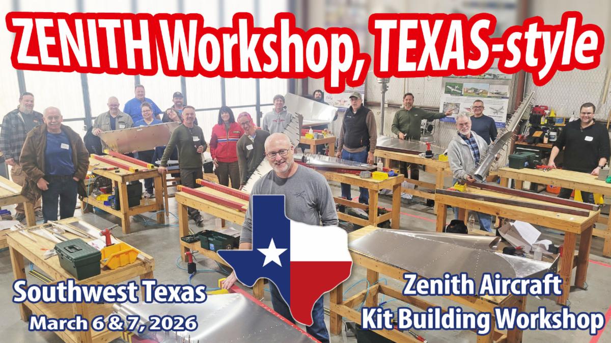 The following week in early March, Zenith Aircraft will be returning to Texas to host its popular hands-on kit aircraft building workshop class, combined with a regional Zenith fly-in and informal builder gathering. The two-day workshop will be held March 6th and 7th at Boerne Stage Airfield (5C1) just north of San Antonio. Zenith Aircraft staff will lead the workshop class, and Zenith builders, pilots, and enthusiasts are invited to attend and participate at an informal Saturday Zenith fly-in gathering at Boerne Stage Airfield, with a program of informal seminars. All Zeniths are invited to fly in for the day’s activities, and Zenith enthusiasts and current builders are invited to drive in or fly in to attend.