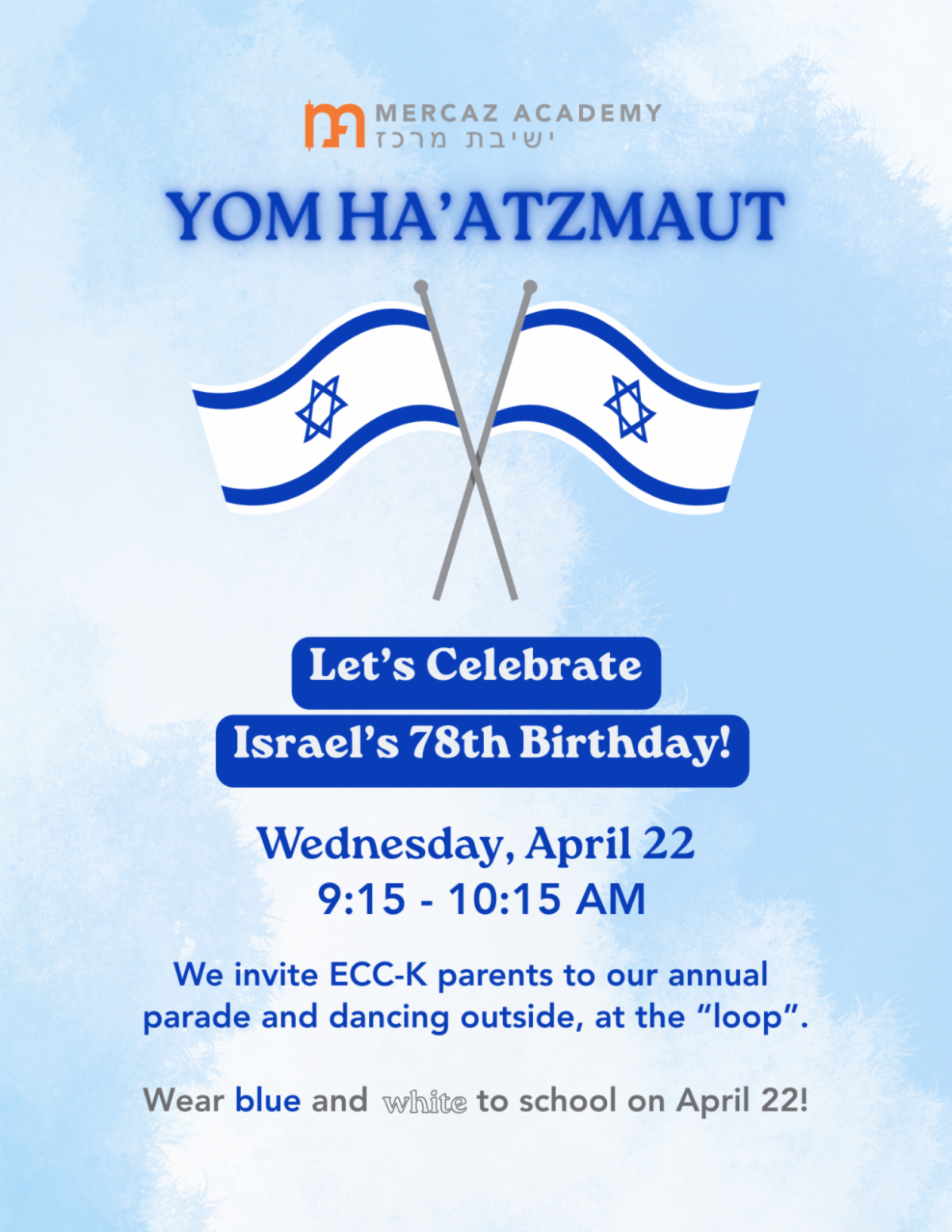 Volume 4, Issue 13 | April 16, 2026 | | Ushering in a two-week period of meaning, mourning, and celebrating for the Jewish people as we observe Yom HaShoah, Yom HaZikaron, and Yom HaAtzmaut, Mercaz is immersed in lessons surrounding peoplehood, history, and place. Read on for a glimpse into our week at school and reminders about important upcoming events. | | 🕯️ “Remember and Tell Your Children”: A Survivor's Story on Yom HaShoah | | |