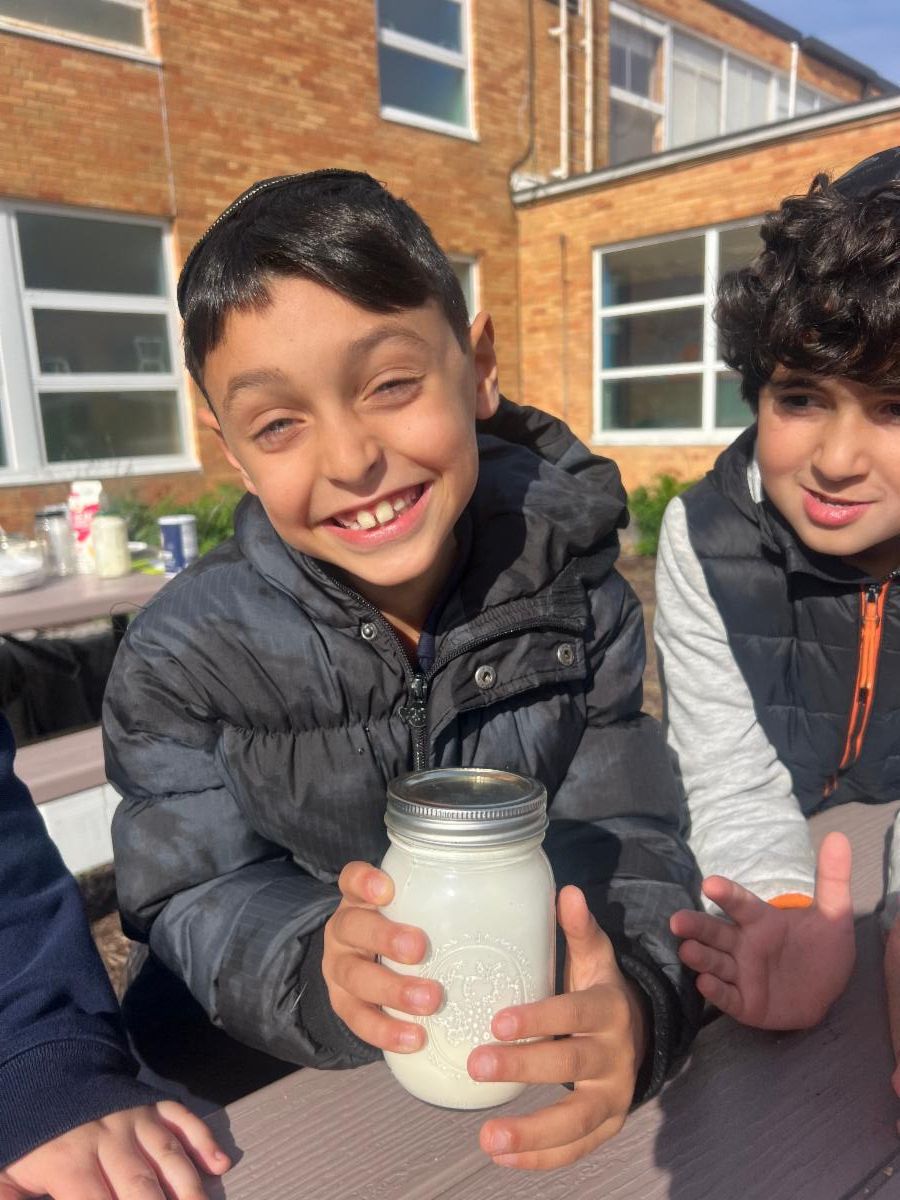 As part of our Farm-to-Table experience, students made herb butter from scratch, shaking heavy cream into butter and mixing in parsley harvested from our own garden. We then spread it on egg matzah for a delicious, parsha-inspired treat—since some commentators teach that Avraham’s guests may have visited during Pesach, and that the bread he served could have been matzah!