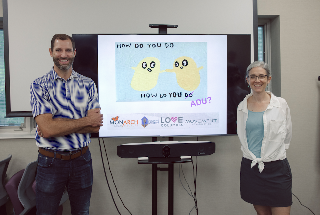 Adrienne Stolwyk local architect and Nick Timberlake local builder, presented ADU history, design and process to a packed room of Columbia neighbors. Attendees ranged from families considering housing options for their college aged children or relatives in need of long term care, to affordable housing advocates exploring solutions in which they could participate.