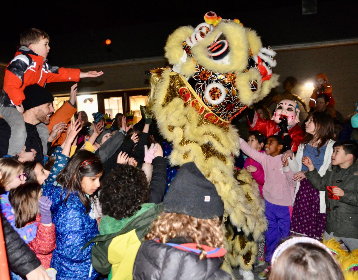 Shady Hill ushered in the Year of the Dragon with a spirited Lunar New Year party for all students and their families, on the evening of February 8. Thanks to the Equity Office, DASH, and legions of hard-working volunteers, party attendees of all ages were able to try DIY dumpling-making, paper lantern crafting, and calligraphy. Guests were fortified with hearty soup in their choice of Chinese dumpling or Korean rice cake styles, as well as delicious bubble tea. The evening wrapped up with an outdoor parade and performance by a professional lion dance troupe. The otherwise-chilly February evening was warmed by our strong and loving community coming together in celebration of cultural diversity.