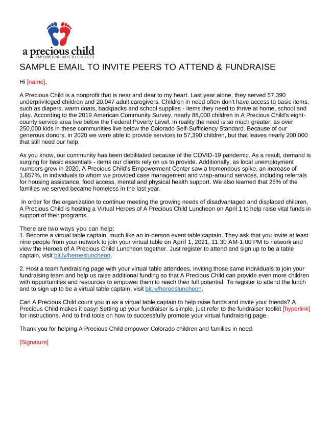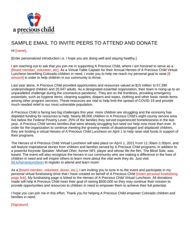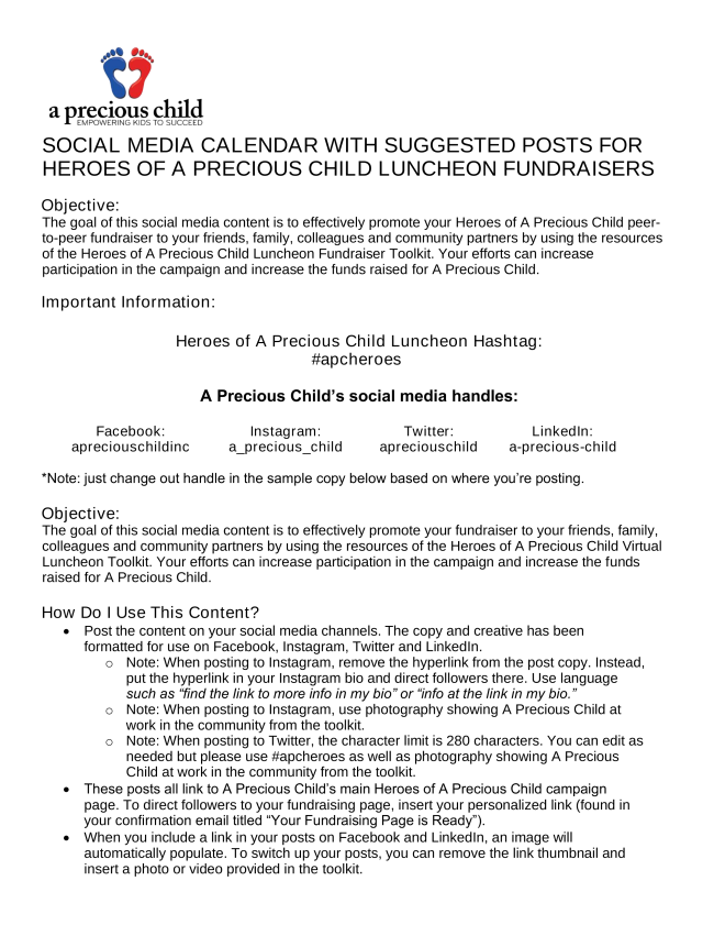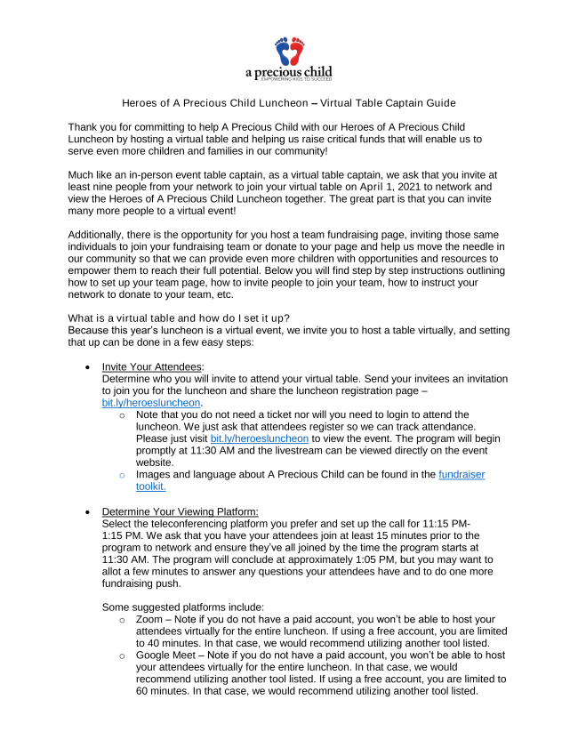 The Heroes of A Precious Child Luncheon fundraiser will also include individual donors who can sign up to host a solo peer to peer fundraiser or host or join a team fundraiser page, set their own fundraising goals, and share via social media platforms to raise awareness and funds to help meet our goal.