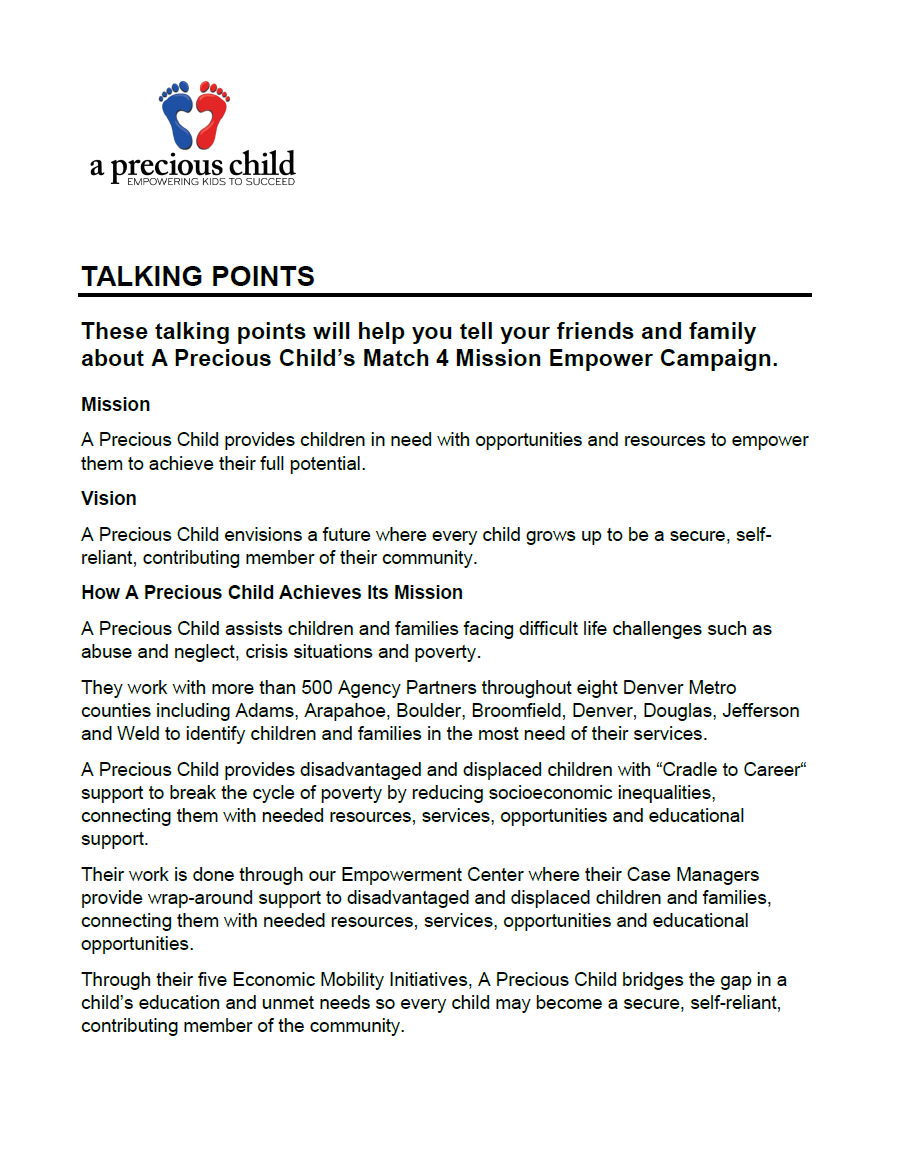 The Annual Heroes of A Precious Child Luncheon, presented by FTI Consulting, will be a virtual event, featuring inspirational stories from children and families we've had the privilege of serving, in addition to a powerful keynote speaker, Michael Oher, former NFL player and whose life the film, The Blind Side, was based. Although there is no cost to attend, this event is one of our most significant fundraisers of the year, supporting our mission and providing for disadvantaged and displaced children in Colorado.