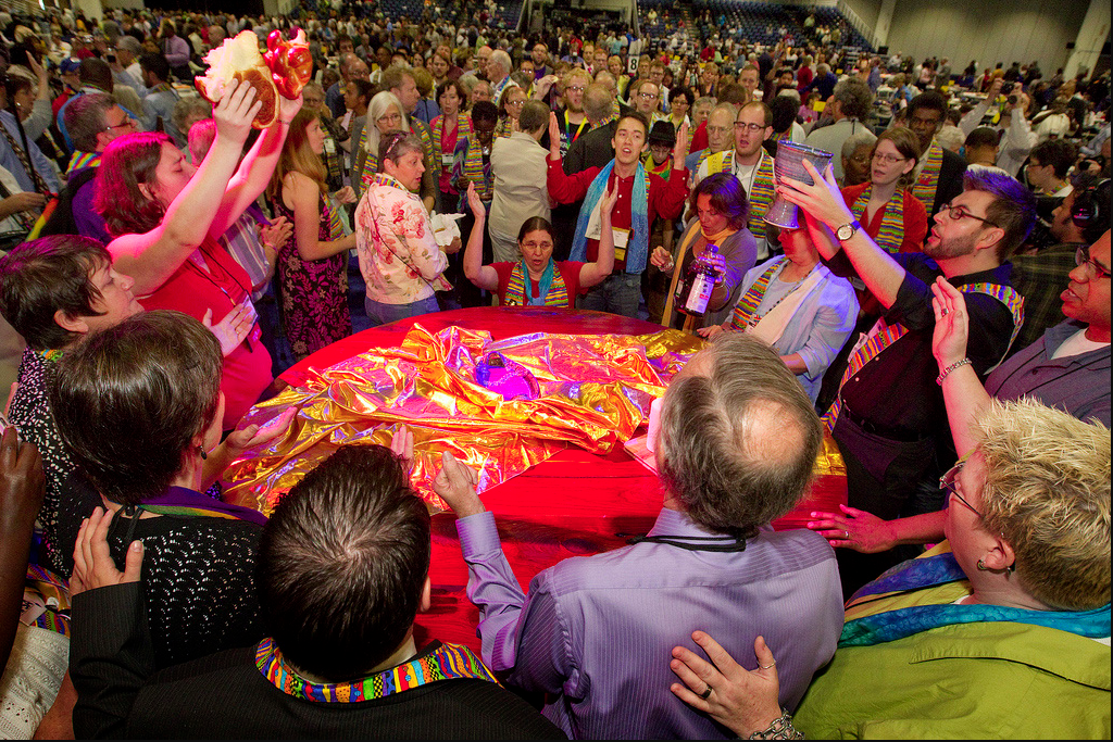 Protesters against the United Methodist Church's stance on sexuality prepare to serve Holy Communion inside the bar of the 2012 General Conference in Tampa, Florida. A UMNS photo by Mike DuBose.