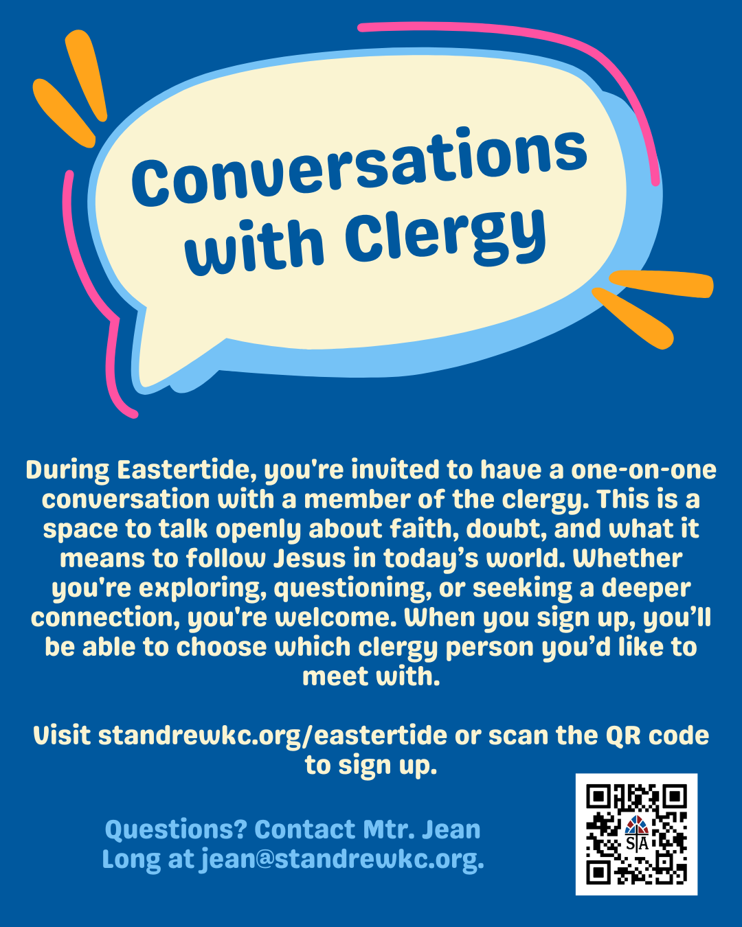 Sign up for a one-on-one conversation with a clergy member to explore what it means to follow Jesus in today’s world.