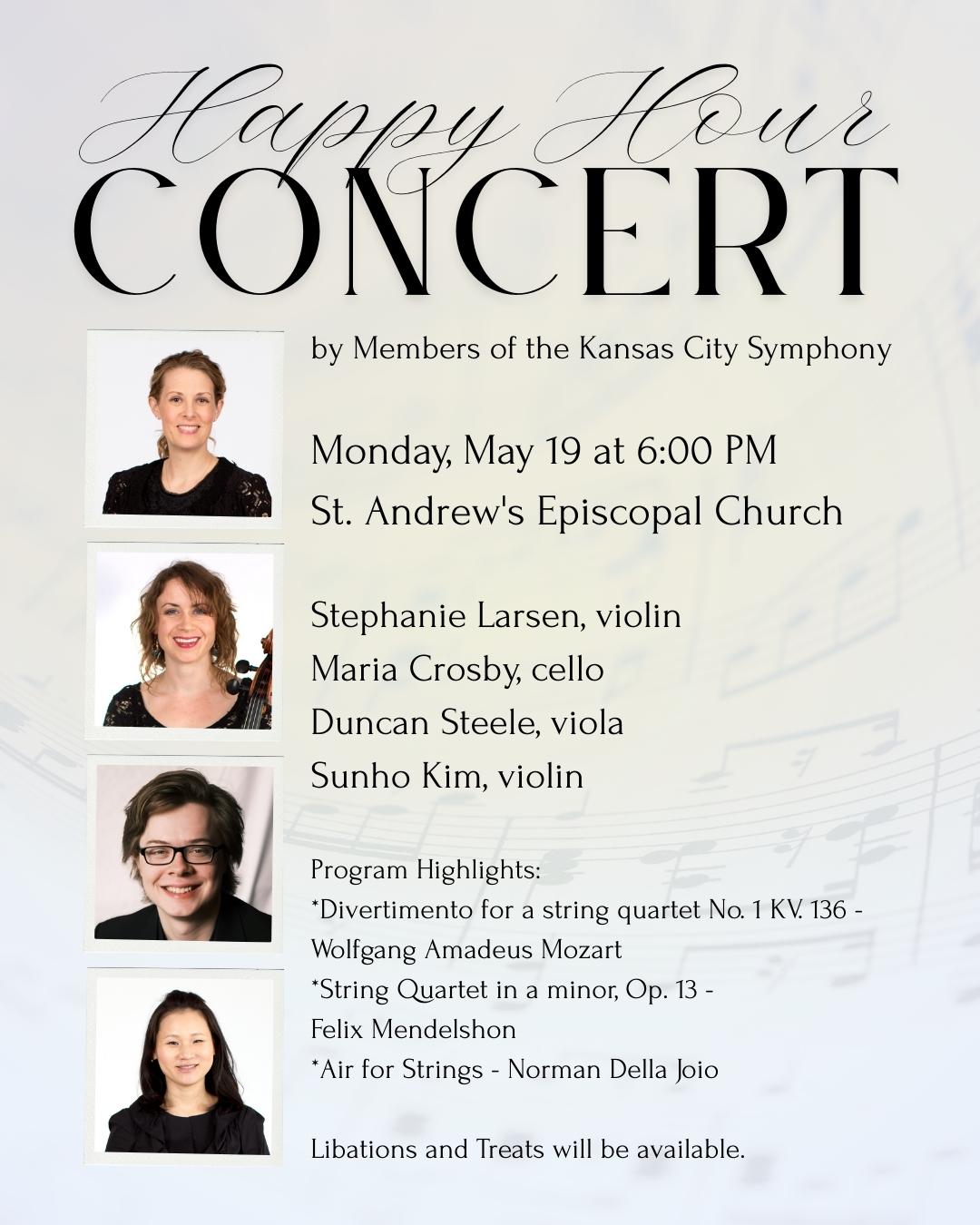 Monday, May 19 – Happy Hour Concert at St. Andrew’s featuring members of the Kansas City Symphony and our own Sunho Kim on violin. Join us at 6 p.m.—libations and treats will be available.
