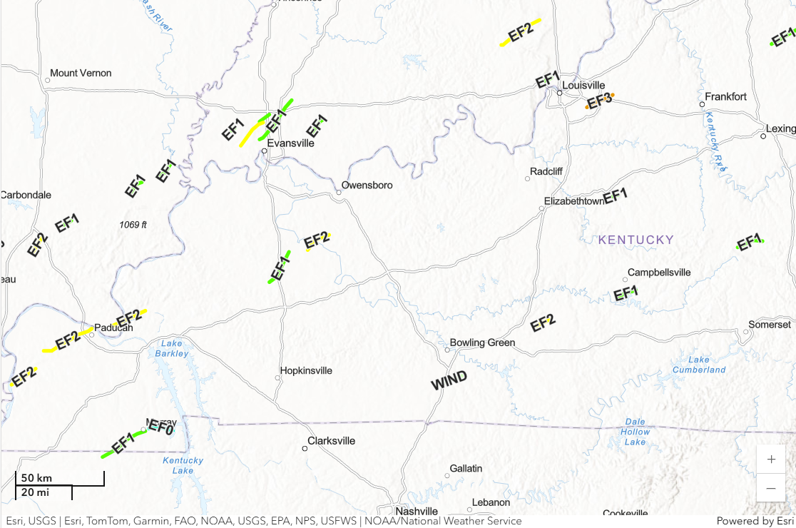 Across Kentucky, the National Weather Service offices in Paducah and Louisville confirmed 13 tornadoes. Western Kentucky saw several EF-2 tornadoes with estimated peak winds of 115 mph. However, the strongest tornado was confirmed in Louisville, where peak winds were estimated at 145 mph (map below).
