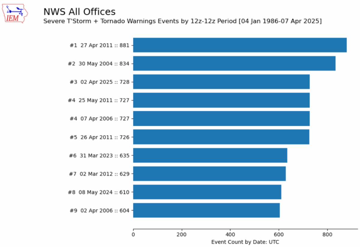 Kentucky was only a small part of this large system. According to the Iowa Environmental Mesonet, the National Weather Service issued a staggering 728 Tornado and Severe Thunderstorm Warnings that day—making it the third highest warning count for a single day since 2011 (chart below).
