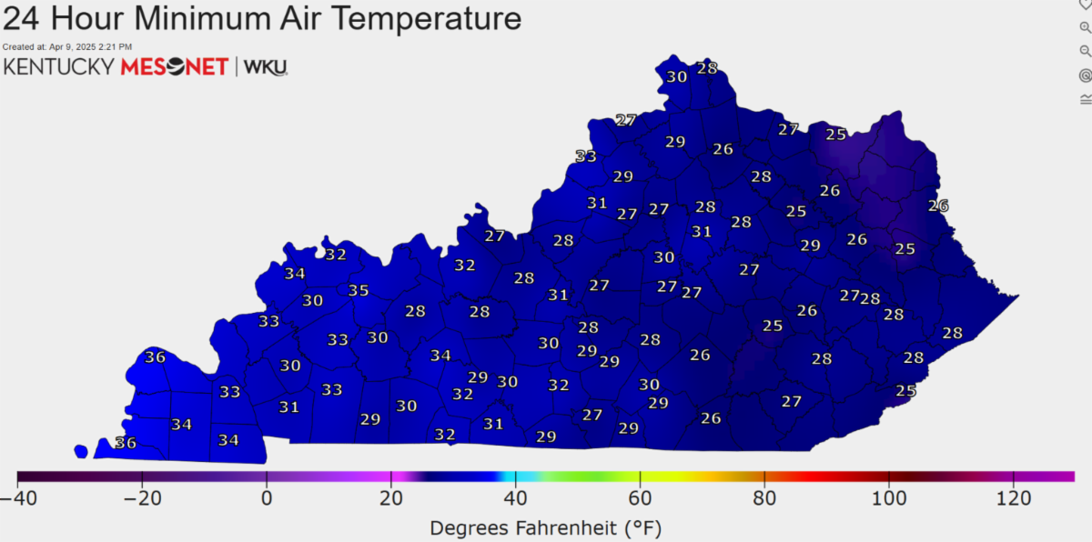 Adding to the challenges posed by excessive rainfall and storms, temperatures plummeted over the past couple of nights. With agriculture becoming increasingly vulnerable, the National Weather Service issued the first freeze warnings of the spring season. The Kentucky Mesonet recorded low temperatures on the morning of April 9th in the mid-20s to mid-30s (map below). Typically, low temperatures for this time of year range in the low to mid-40s, making these readings significantly below normal—though not entirely unusual.