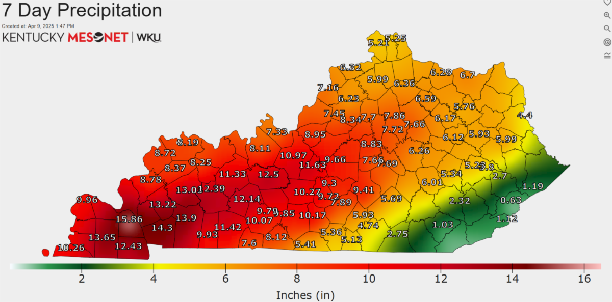 | | Good evening, folks! Between relentless rainfall and subfreezing temperatures, the start of this growing season has been anything but ideal. According to data from the Ag Weather Center, Kentucky averaged 7.56 inches of rain last week. However, rainfall totals varied widely across Kentucky, ranging from a staggering 15.87 inches at the Marshall County Mesonet station to a mere 0.63 inches in Letcher County. As shown in the map below, much of Western and Central Kentucky exceeded 10 inches of rainfall (courtesy of the Kentucky Mesonet). | |