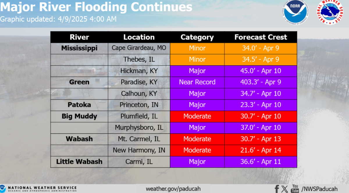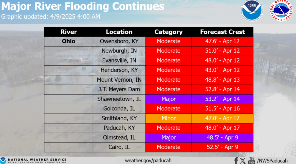 Looking at the data, most rivers in Central Kentucky have already reached their crest and are beginning to recede, while many Western Kentucky are projected to crest within the next week. The graphic below from the National Weather Service in Paducah provides an excellent summary of this information. However, it’s important to note that these are forecasted crests—it will take time for the rivers to fully recede. In the Purchase area, current forecasts indicate the Ohio River at Cairo and Mississippi River at Hickman will remain in moderate flood stage through April 22nd.