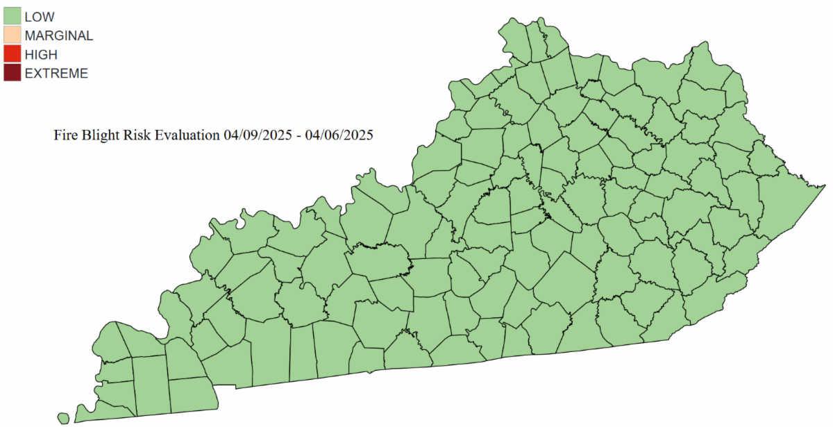 | In closing, I wanted to highlight the Fire Blight Alert. This tool, developed collaboratively by UK Plant Pathologists and the Ag Center, provides guidance on the risk of infection for blooming apple and pear trees. As of the latest assessment on April 9th, the risk remains relatively low across the state. However, producers are encouraged to monitor the tool regularly for updated guidance. For more information on this topic, including access to the model and pest management strategies, follow this link. |