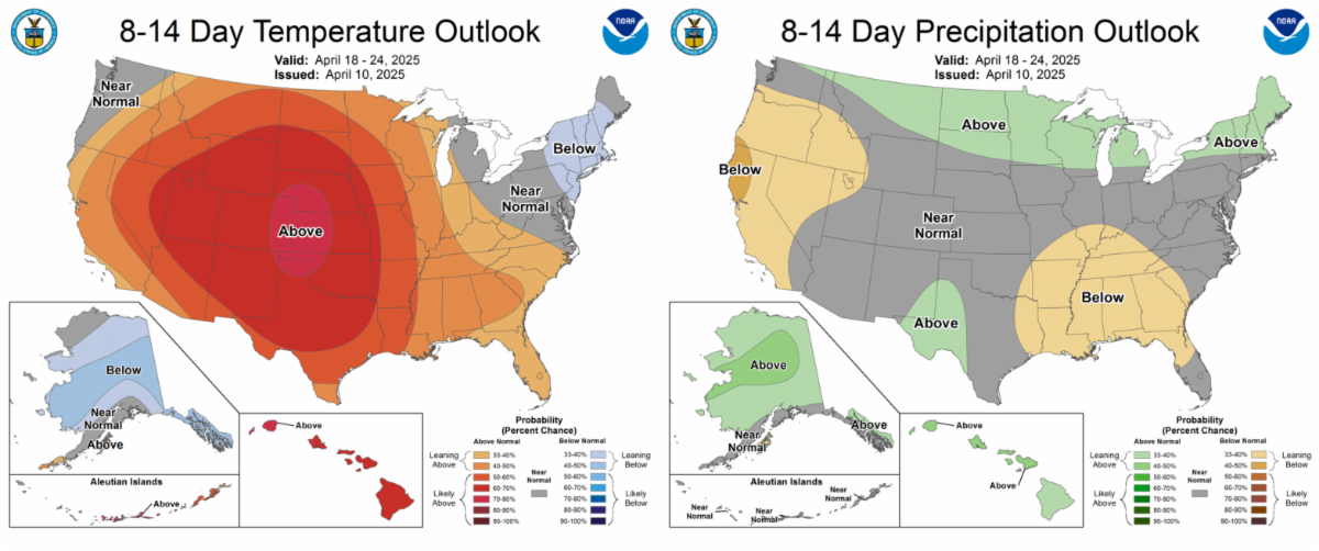 Shifting focus to the long-term outlooks, the forecasts are looking more promising compared to yesterday! For April 16-20, the 6-10 day outlook predicts below-normal temperatures with near-normal precipitation. Moving into the 8-14 day outlook (April 18-24), there’s a higher likelihood of above-normal temperatures making a return, paired with below-normal precipitation. Looking even further ahead to the 3-4 week outlook (April 19-May 2), above-normal precipitation is expected, while temperature trends remain uncertain. What does this mean for planting in 2025? While it's been a slow start, a "glass half full" approach reveals encouraging signs: no indications of severe cold air outbreaks or heavy rainfall events ahead.
