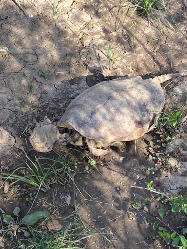 I decided to walk around the pond, not on the paths, but through the underbrush. Suddenly I was shocked to see a snapping turtle on the path. But on closer inspection I saw that it was dead and dried out. I still poked to make sure.