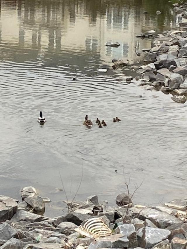 One of the most wonderful sights was heralded by the quacking of a duck, coming out from under the bridge by the outflow of the pond. She was closely followed by seven ducklings. Pretty soon another duck, perhaps the father, took the rear guard. When a third duck began to intrude on them, the two began to chase and herd him away, eventually forcing him to cross the street into the outflow area of the pond.