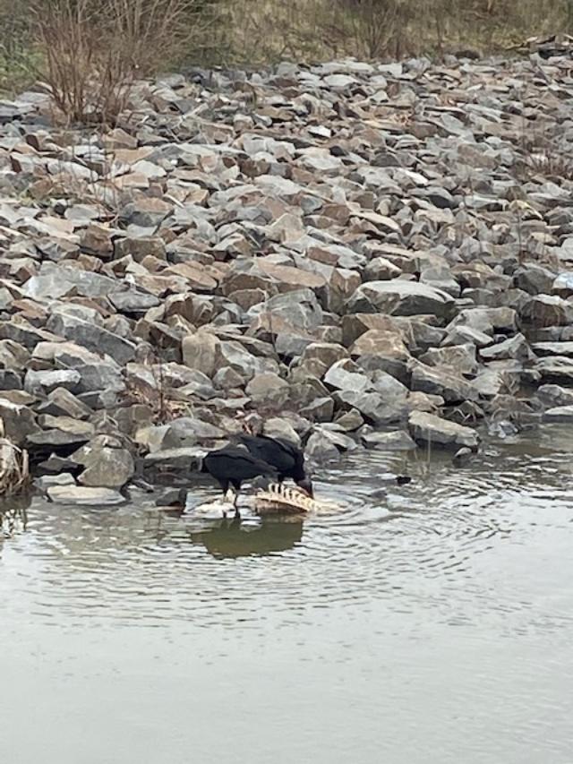 Nearby I saw some big, black birds circling. I found out that they were vultures. Later on, as I walked around the other side of the pond, I saw what looked like a very tall, skinny bird statue a few feet into the water. Then the statue flapped its wings and flew gracefully away. I found out that it was a blue heron.