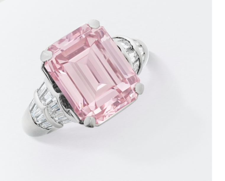 Doubling the high estimate, in second place for the highest price paid, Lot #43, the Fancy Intense Pink emerald-cut diamond, 6.99 carats, accented by baguette-cut diamonds, set in platinum, that sold for USD$10,284,604 (9,145,000 CHF).