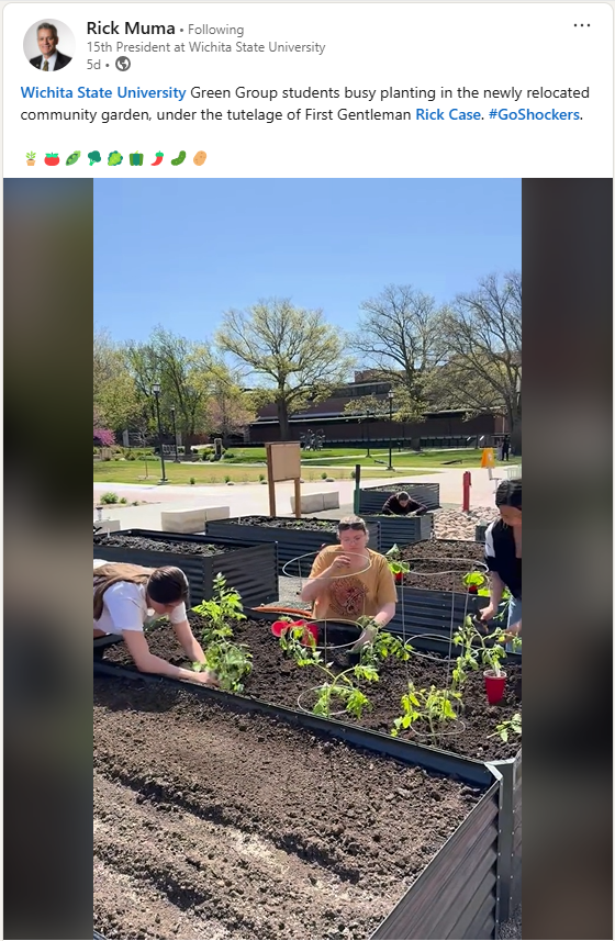 Wichita State University Green Group students busy planting in the newly relocated community garden, under the tutelage of First Gentleman Rick Case. #GoShockers.