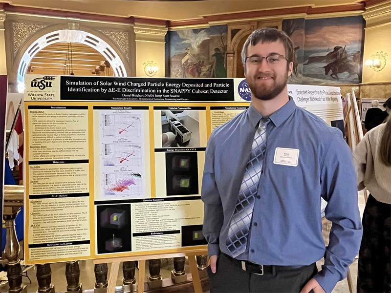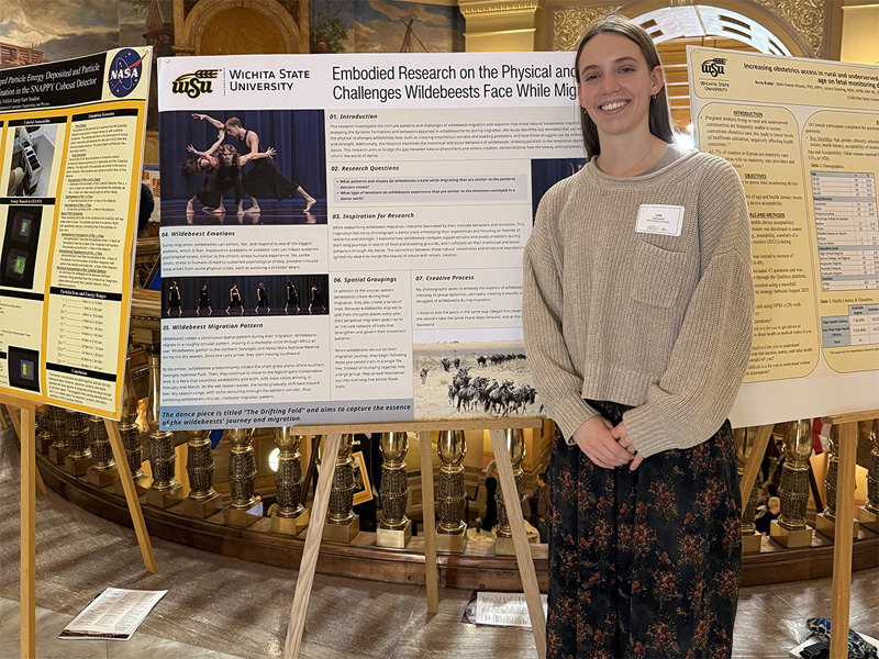 | | Featured student research | | Wichita State University's research emphasis includes opportunities for undergraduate and graduate students, as well as faculty and staff, and extends across campus from aerospace to ancient civilizations and business administration to biochemistry. | | Lillie Nightingale, dancing with wildebeests | Lille Nightingale combined her lifelong fascination with animals and her passion for dance to create a capstone project researching the emotional and physical challenges of wildebeest migration. Guided by a team of dedicated faculty mentors, she translated her research into a compelling group performance that reflects the patterns, struggles and shared emotional experiences of both humans and animals. | | | Sejun Moon, exploring Mars | Wichita State junior Sejun Moon is exploring how teams of autonomous robots work together in extreme environments like Mars using a multi-agent reinforcement learning approach. Under the guidance of Dr. Fujian Yan, Moon is developing a scalable, hierarchical system that enables robot collaboration with minimal human input — a concept with promising applications for both space exploration and disaster response here on Earth. | | | Daniel Reichart, exploring the cosmos | Daniel Reichart uses advanced simulations to study how a CubeSat detector can identify space particles like electrons, protons and alpha particles. His work, guided by physics professor Dr. Nick Solomey and supported by NASA’s Jumpstart Program, contributes to understanding radiation hazards in space and showcases how undergraduates can play a vital role in space research. | | | Anna Brake, bridging health care gaps | |