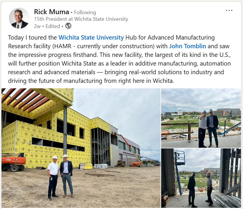 Today I toured the Wichita State University Hub for Advanced Manufacturing Research facility (HAMR - currently under construction) with John Tomblin and saw the impressive progress firsthand. This new facility, the largest of its kind in the U.S., will further position Wichita State as a leader in additive manufacturing, automation research and advanced materials — bringing real-world solutions to industry and driving the future of manufacturing from right here in Wichita.