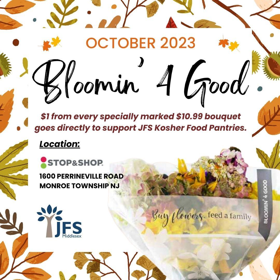 Exciting news! For the month of October, JFS Kosher Food Pantries have been selected to participate in the Stop & Shop Bloomin’ 4 Good Program. For every specially marked $10.99 Bloomin' 4 Good bouquet purchased, $1 goes directly to support JFS Kosher Food Pantries.