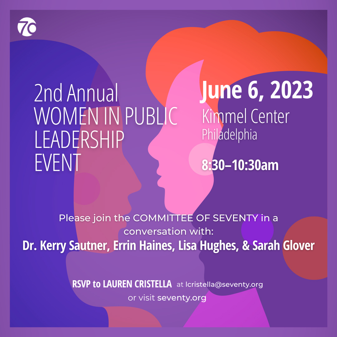 The Committee of Seventy’s Second Annual Women in Public Leadership event features a timely and important conversation on the vital role the media plays in a democracy. Dr. Kerry Sautner, Chief Learning Officer for the National Constitution Center, will moderate the discussion between Errin Haines, Editor-at-Large and Founder of the 19th*; Lisa Hughes, publisher & CEO of The Philadelphia Inquirer; and Sarah Glover, VP of News & Civic Dialogue at WHYY to discuss their path to leadership, how news organizations can strengthen democracy, and the challenges and opportunities their industries face in light of the heightened partisanship facing our nation. C70 will also honor renowned civic leader, Sharmain Matlock-Turner, CEO of the Urban Affairs Coalition, for her tireless work advancing social and economic justice, promoting voter engagement, and advocating for the rights of marginalized communities. Purcahse a ticket.