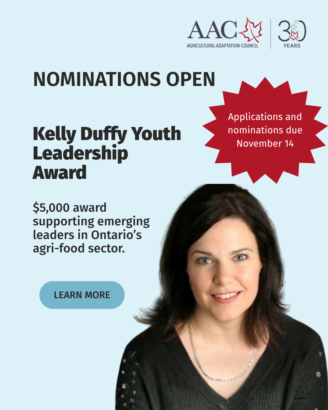 AAC member organizations are invited to nominate youth pursuing education, training or professional development in the agri-food sector. The deadline for AAC member organizations to submit the nomination and for applicants to submit their application form is Friday, November 14, 2025. The inaugural award will be presented at AAC’s Annual General Meeting in December 2025, and the recipient will also receive a one-year ex-officio position on the AAC Board of Directors for mentorship and leadership experience.
