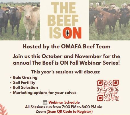 Join the OMAFA Beef Team this October and November for the Beef is ON Fall Beef Webinar Series. This years’ sessions will discuss bale grazing, soil fertility, bull selection and marketing options for your calves.