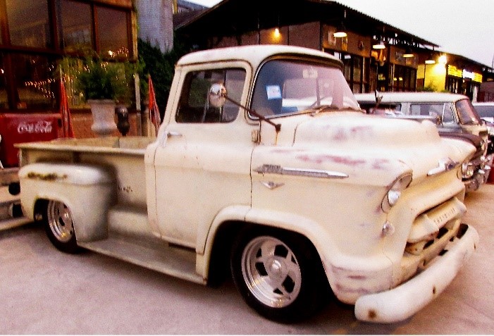 | | The 1959 Chevy Apache 3100 pickup in a sort of permanent display in a flea market, but still easily removed for driving. | | |